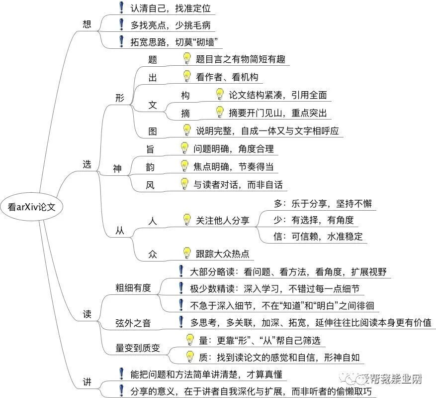 想什么?想定位,想目标,想方法。为啥而看?跟踪前沿?找问题?找方法?膜拜?探坑?找人?找撕?学写作?凑谈资?打发时间?定位清楚了,题材范围自然清晰,不了解自己,只能“通吃”,结果往往是“消化不良”。不管什么定位,有一点很重要:抱着学习的心态去读,收获往往更多。挑剔不会让你显得更有水平,取其精华,取长补短,才是成长正道。读论文的同时也不要忽略读书——打好基础很重要,尤其是论文作者认为“大家都懂”的“常识性”知识。基础好才有“根”,新来的知识和思考才有关联和生长的“干”,终能长成一棵健康茂密的参天之“树”。