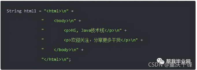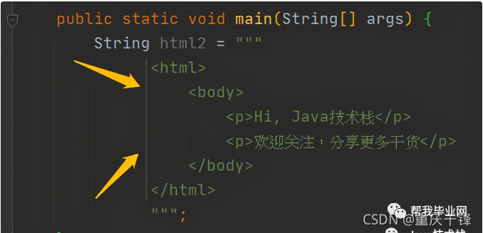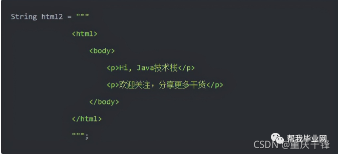 如上面介绍,编译器自动增加换行符可以用来增强用非 Java 语言编写的代码的字符串的可读性,比如我们经常要拼接 HTML、XML、SQL 语言代码等,代码非常难看。