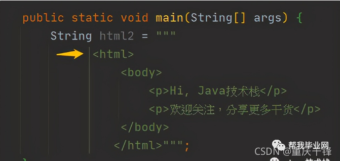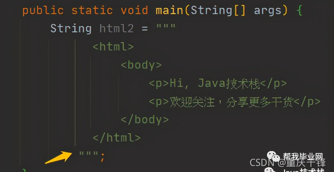 文本块需要用三个双引号包起来,熟悉 Python 的都知道,三个双引号表示多行注释,没想到 Java 竟然用作了多行字符串……
